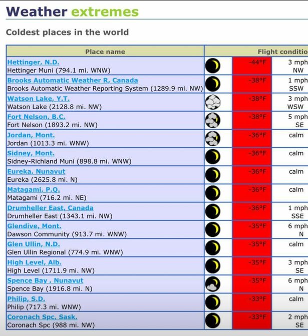 | 12 | Faro, Y. T. (Canada) | 71949 | -43.3°C |