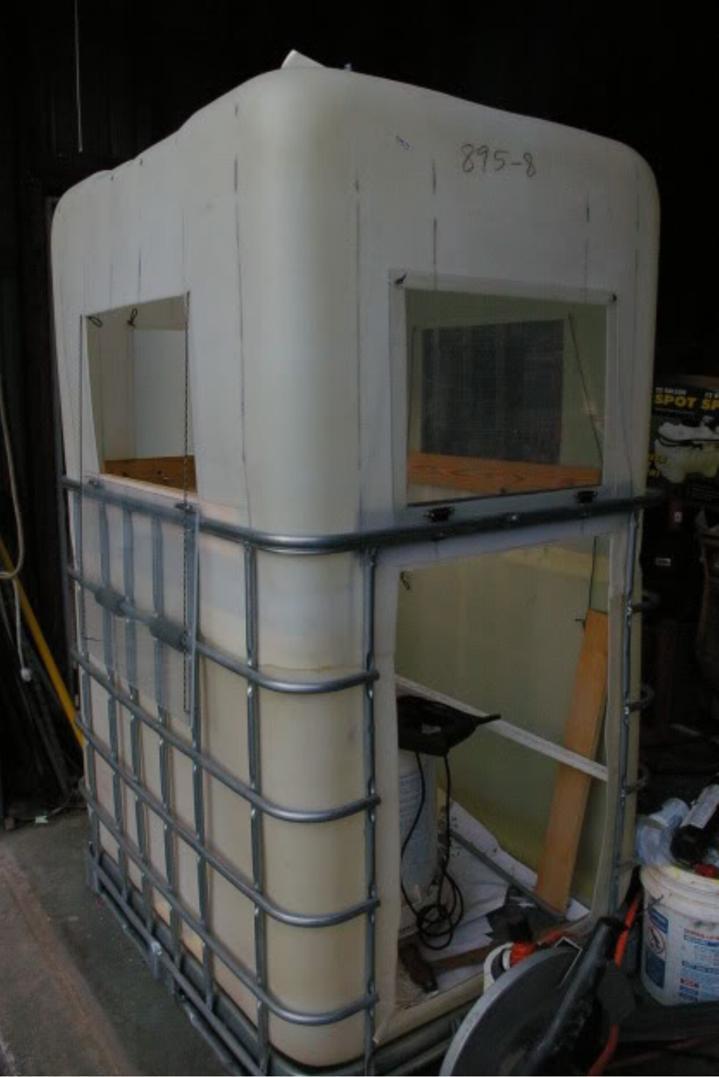 Find a bulk plastic tank with a crack or defect. kind of like the guys ice house that is at Grano every year. small trailer set it up on end with the trailer attached. I need to get a pic of it sometime.