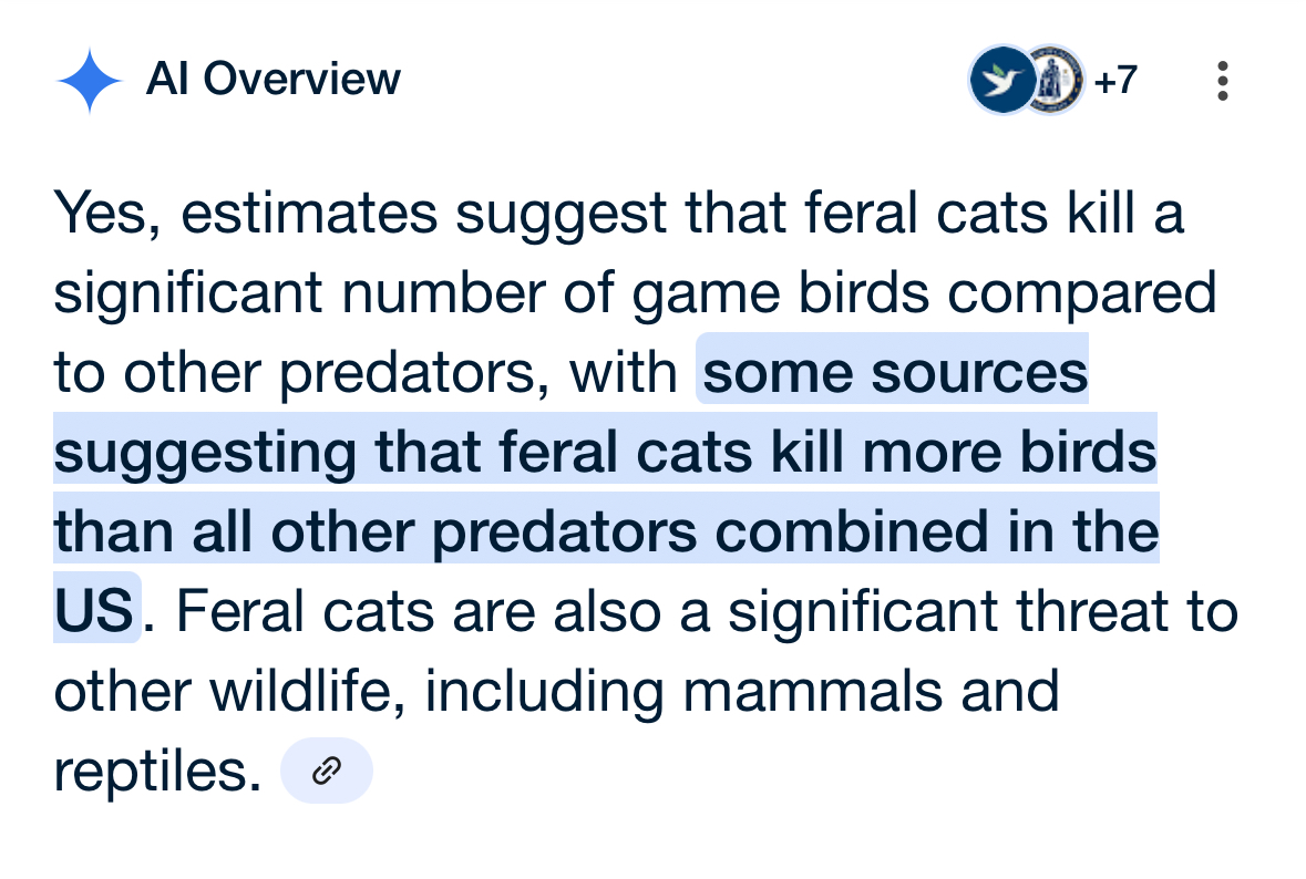 Huh?Feral cats kill more game birds than all the other predators combined.