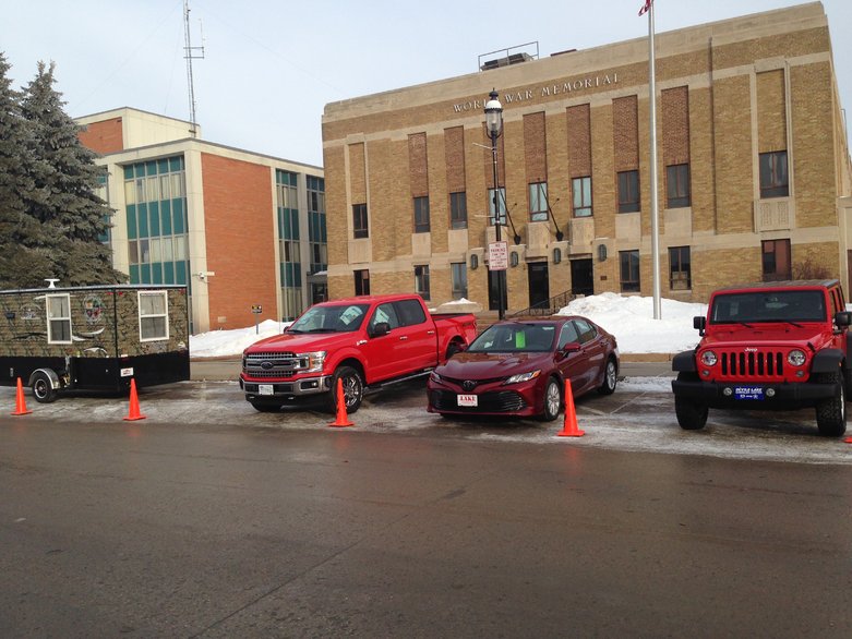Walked by the Memorial Building to take a look at a few of the major prizes this year! Yeah, I'd take any of them. Good tournament run by good people. One year I hope to win something.Jeep and fish house are fishing prizes, Truck and car- raffle prizes.