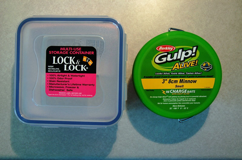 I use Lock & Lock food containers for all my Gulp! I start with a bucket of Gulp Alive! and add various packaged Gulp!, PowerBait, etc. as needed. I soak pretty much everything in juice. There are a few colors that will bleed though over time and some Gulp! tends to harden as it sits in the juice for a few years. Any food container with a silicone seal system will work well in my experience. Gulp! and PowerBait is good stuff...