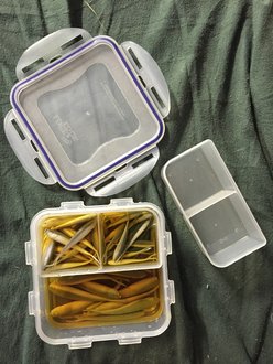 I use Lock & Lock food containers for all my Gulp! I start with a bucket of Gulp Alive! and add various packaged Gulp!, PowerBait, etc. as needed. I soak pretty much everything in juice. There are a few colors that will bleed though over time and some Gulp! tends to harden as it sits in the juice for a few years. Any food container with a silicone seal system will work well in my experience. Gulp! and PowerBait is good stuff...