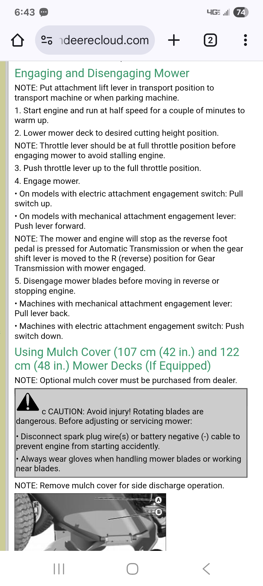 Also I normally engage the mower at half throttle or so and then bring it up to full throttle once it's engaged. Seems to me it would be harder on the clutch and drive train to engage at full throttle. This is for a larger tractor anyway, maybe a smaller mower would need to be at full throttle to not kill the engine.