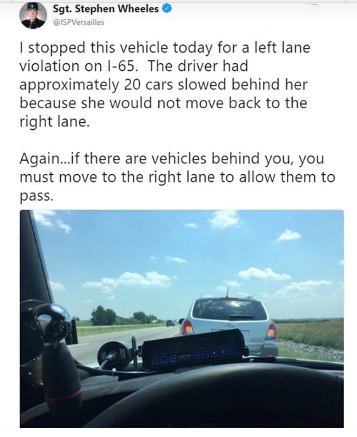 They should also ticket those who forgot one car length for every ten miles per hour, and pull in front of a person so close it engages automatic braking. Then the next car passes and does the same. Soon you find yourself from 75 mph down to 50 and you have to turn off cruise. Left lane driving is a problem, but not as bad as those who are so proud of how fast they can get in the right lane. I think there may be a few culprits here.