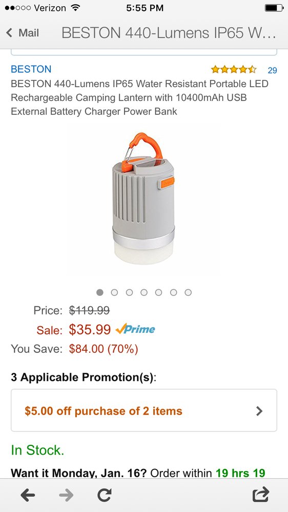 I picked up one of these, 400 lumens on high, rechargeable led w on board charge for any USB device, smaller than a beer can, weighs ounces