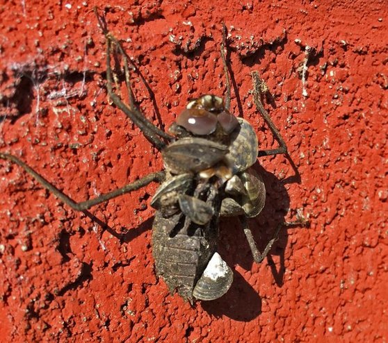 Photo courtesy of Mark and Amy Hinzmann: Look close at this nymph that came out of Sand Lake and crawled up the wall of the Hinzmann's cabin where it will emerge, I think as a dragonfly. Look even closer and you'll see that riding on the nymph back are some zebra Mussels; now what?