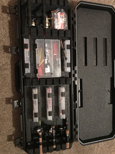 I bought a Plano Tactical gun case last year, don't have to break down the reel handles. Just foam inside, doesn't have slots or anything to hold rods in individual spots, but there is plenty of room in it and rods stay put inside. Good strong latches and handle, seems like it'll take a beating.