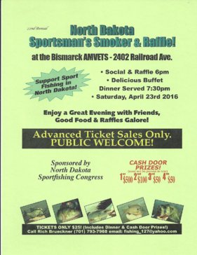 22 annual North Dakota Sportsman's Smoker and Raffle sponsored by North Dakota Sportfishing Congress. Banquet is on Saturday April 23rd, 2016 at the AMVETS with social at 6 PM and Prime Rib Dinner served at 7:30 PM. Emjoy a Great Evening with Friends, Good Food, and Raffles Galore. Thanks