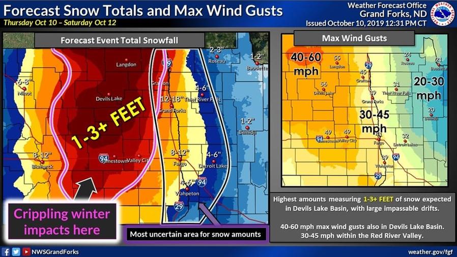 It is not often we message impacts this severe, however given our increased confidence in extreme snow amounts we feel it is warranted. Those within the highest impacted areas (Devils Lake Basin into the James River Valley of North Dakota) prepare for several days of impossible travel and the chance of being snowed in. This could develop into a very serious situation.