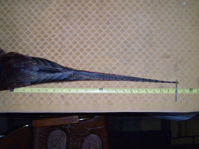 Just pull the tail feathers from a bird you don't care about, measure the part that was in the meat, and add that length to your long one. I would think that would get you very close to the true length.