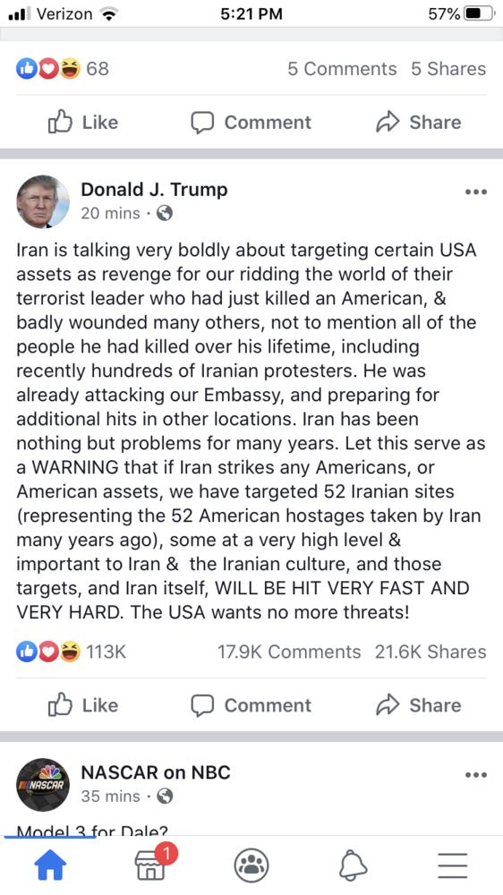 Relax people. The leaders of Iran ARE NOT STUPID!! Evil, demented, sadistic, murderous, and just plain wicked people, YES, but NOT STUPID. We knocked off Husein's whole program in 100 days and these same Iranian leaders watched it. Keep in mind folks, People in power WANT TO STAY IN POWER!! Think little FAT BOY in N Korea and all his blustering and banter. The ayatollah or whatever you call their top booger eater does NOT WANT to have his shit stacked, packed, and air mailed to allah, regardless of what he says. His words are just that....words. Let him grunt, growl, and make faces. Nobody ever died from grunts and rhetoric. Are they going to car bomb a place or launch a few rockets to "save face".....probably. However, it is my belief that the number of US lives lost to these "responses to save face" would be far less than the US lives lost if we had allowed this shitburger to continue his activities and those of his minions. I learned lots of things facing these diaper heads in Afghanistan and one of the greatest was that they are real tough when they have you outnumbered 5 to 1, but make it a fair fight and they want nothing to do with it and run as fast as they can. Iran isn't any different. They DO NOT want a stand up fight. They saw Hussein try it and they also saw what happened to him. Now lets say I'm wrong and Iran does want to rumble. Our military just came off 20 years of combat operations in Iraq and Afghanistan where ALL OUR WEAPON SYSTEMS as well as our TROOPERS, have been hardened to desert and high heat conditions. We no longer have green troops. We only have VETERANS!! Huge difference between greenies and vets. The Iranian military hasn't fought anything but boredom since their Iraq war. Our military might is probably one of the few things we get for our tax dollars that directly benefit each and every one of us. If Iran wants to rumble, we will turn them to rubble. As far as the nukes, biological, and chems go, if they have'em, we'd know about'em, and they would be the first piles of rubble to be made. Our leaders aren't stupid either.