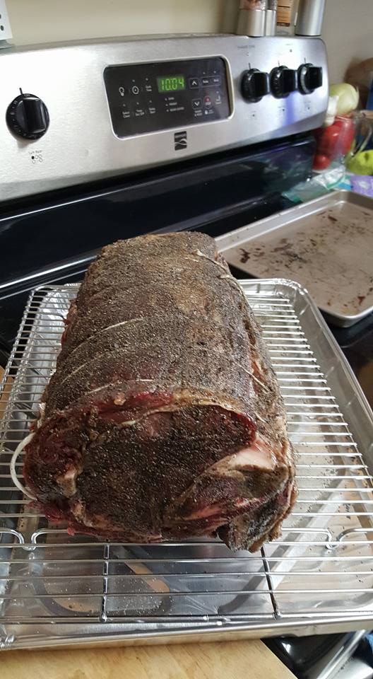 Welp, got one that just went on the traeger. I think it's about 13# or so. Wife picked up a 17 pounder a couple days ago, so last night i prepped it, seasoned it up, threw it in the oven (not on) to acclimate. Tied it up this morning and just threw it on the traeger about 30 minutes ago. I'm cooking it @180 and figure it will take about 6 hours or so. There will be a 1-2 hour set time for it in the cooler, and then when we go to the in-laws place, I will have my mother in law fire up the oven to broil it for a few minutes to get some nice crunchy goodness on the outside. I will post more pics when it is all done. Prime Rib.jpg