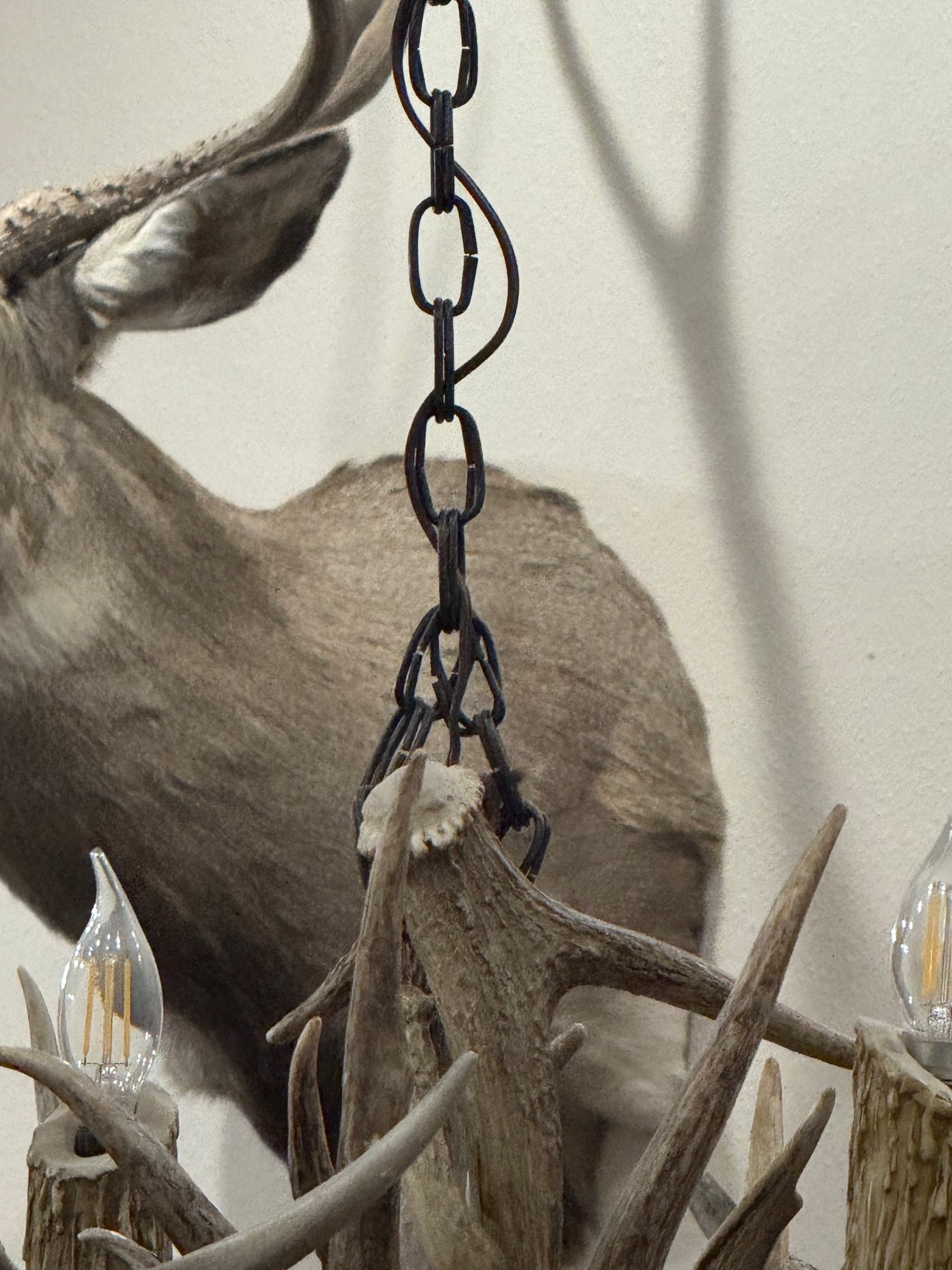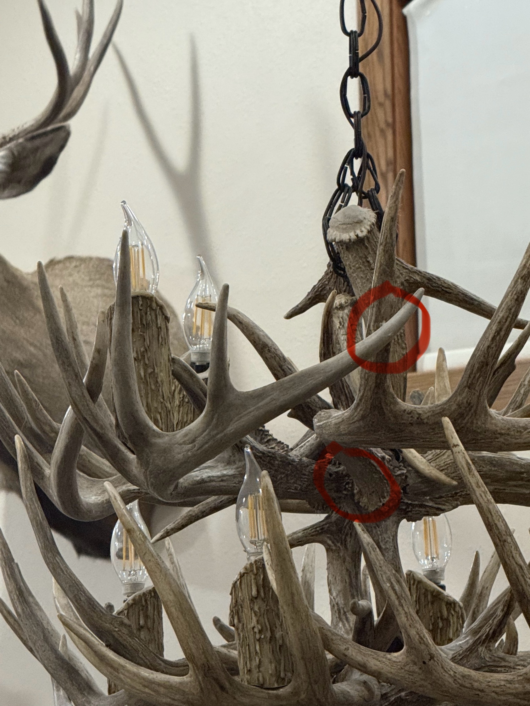 Also, your typical round electrical ceiling box might not cut it for the support that these chandeliers require. They are heavy when they are done. Which also brings up the point of the hang chain. Menards sells your typical light duty hanging light chain, I have used this but I opened the links and doubled them, meaning I beefed up the chain and strength by adding a link to the chain system. That was a real pain. Also, I use construction screws but its important to predrill with the right size bit, or you'll snap heads off your screws since the antler is so hard.