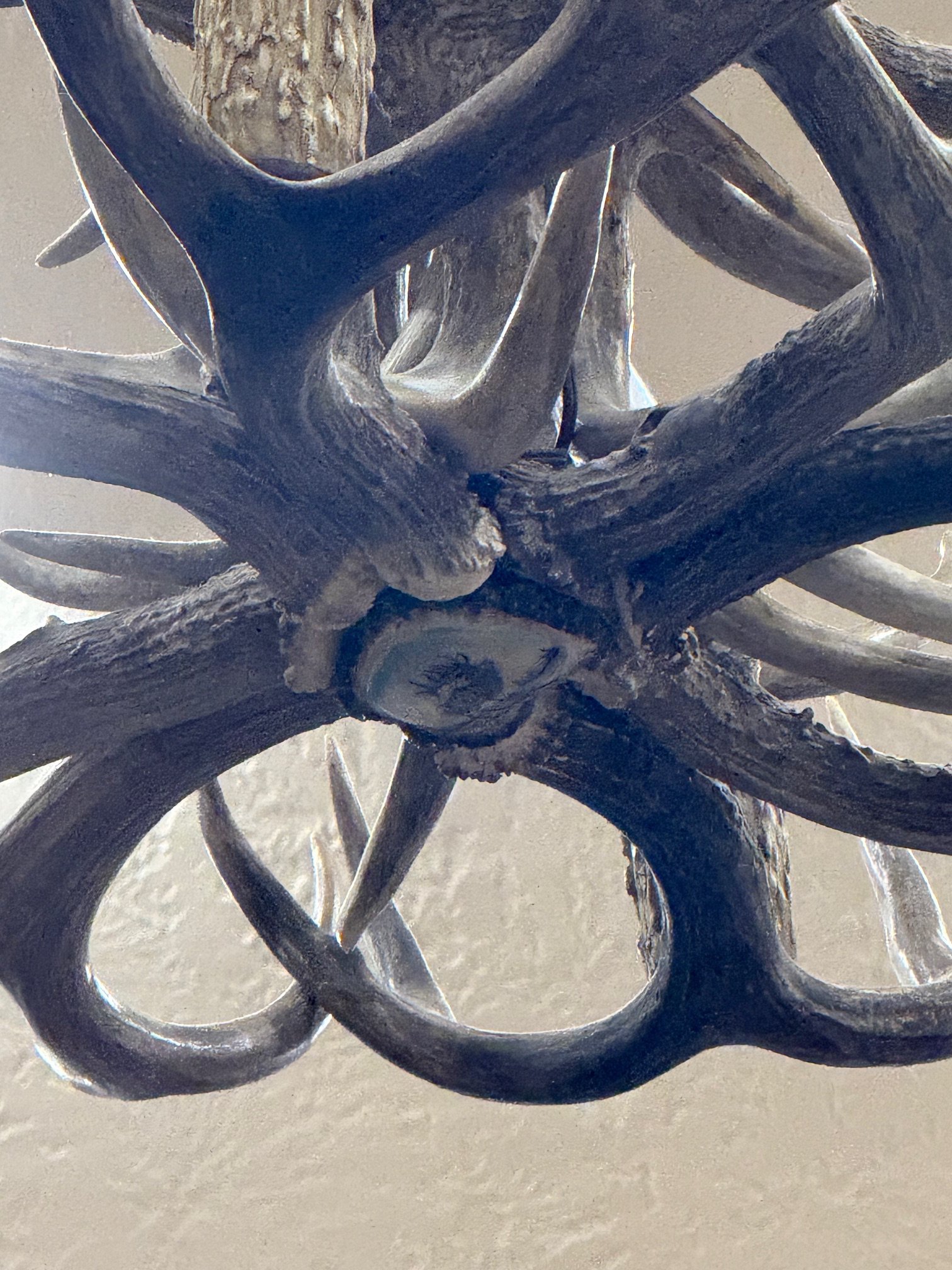 On one that I built, I added a down lamp with glass shade and this one in the pics I just screwed in an old elk base that was painted and used as a belt buckle to fill in the space where all of the antlers are joined in the center.