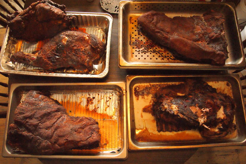 Thanx KDM,dry mustard eh?I use all the other you touched on,only lather yellow mustard instead of the dry.neighbor is a self appointed pit master,his smoker he built is a 500lb propane tank cut in half on wheels,big side wood box attached...one of those guyz...he tells me to brine the pork roasts over night in a brown sugar.koshar salt mix then like you another day or two in a dry rub,tried his method can't say that brining makes a difference,but the yellow mustard glaze adds good flavor,also keep the pork chilled before hitting the smoker as it seems to make a better bark but yours looks great,iifin a guy goes thru all this prep work ,pounds a few beers preping,chef choice of course does it really matter if the pig flesh is room temp or chilled? me thinks no...steak yes when grilled but hard to screw up a pork roast.
