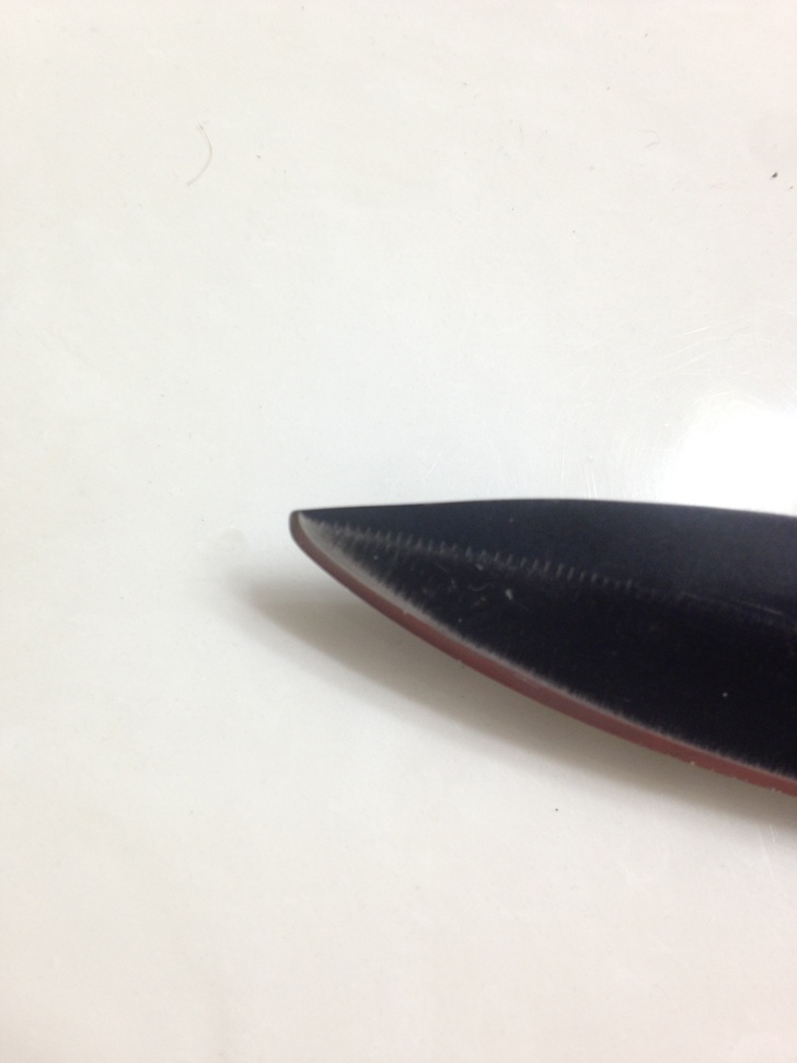 So this is what my pocket knife looked like after I got done experimenting with the work sharp. Not happy about it. I went the direction of sweeney and broke out my smaller stone (course and fine grit). After about 15 minutes of small circles, I ended up with this.