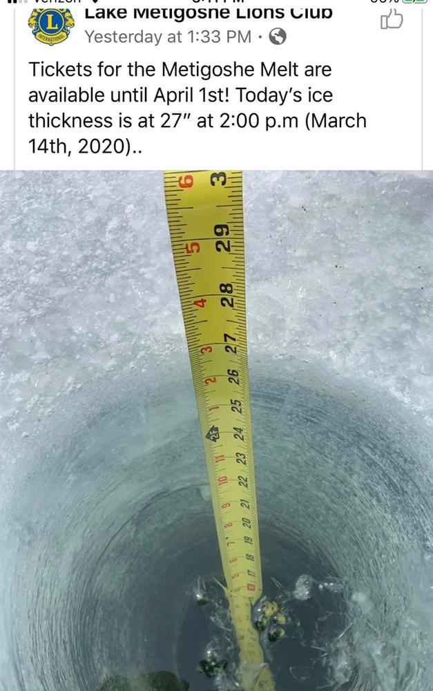 If anyone hasn't had their hard water ice fishing fix yet, the wife found this on Facebook today: ice thickness on Metigoshe.